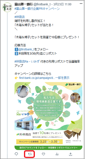 当行では、林商店様タイアップによる「木箱&椅子セット」をプレゼントするキャンペーンを富山第一銀行公式Xアカウント上で実施いたします。