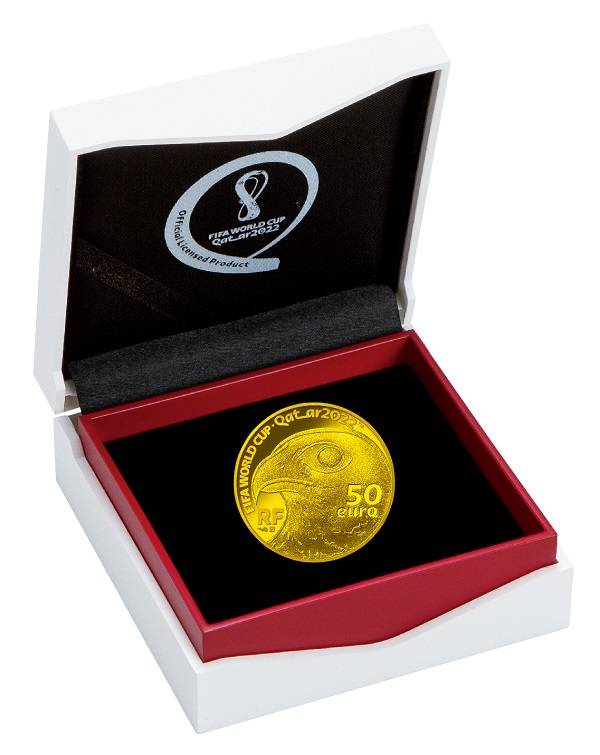 カタールの国鳥である鷹(ファルコン)の頭部を大きく描き、目をサッカーボールの形に見立てた斬新なデザイン。くちばしや毛並みなどもリアルに表現されており、フランス国立造幣局の高い技術と芸術性が融合しています。額面や大会名、発行国名(République Française)の頭文字「RF」も刻まれています。 ※50ユーロ金貨は額面の表示が異なります 【表面】 中央に大会公式エンブレムを立体的かつ精緻に描き、公式ロゴとそれを取り囲むようにサッカーボールなどをアーチ状に刻んだ格調高いデザインです。発行年「2021」を囲むのはアラビア語特有の文字を伸ばす記号“カシーダ”を表す公式アートワークで「Play」「Together」と記されています |