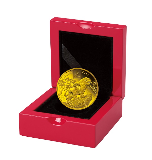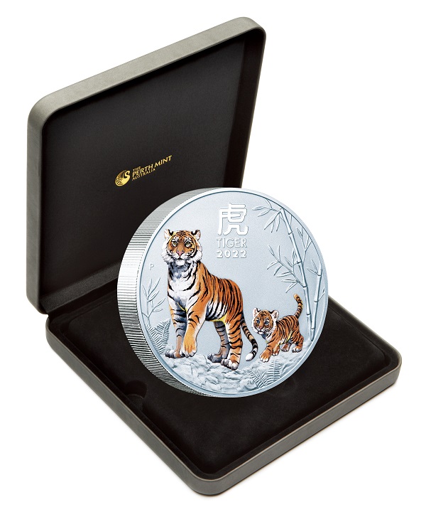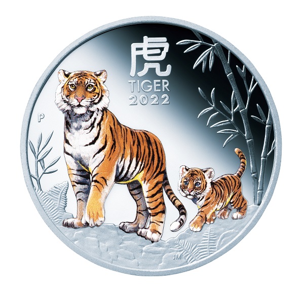 岩場を歩く愛らしい親子の虎の姿が鮮やかなカラーで描かれ、周りには竹やシダ植物などがコラージュされています。漢字で大きく「虎」、英語で「TIGER2022」、パース造幣局のシンボル「P」も刻印されています。直径約100㎜(500円玉硬貨の約3.77倍)、重さ約1kg(同約143倍)、厚さ14.5㎜の圧倒的な存在感とともにお楽しみいただけます。
