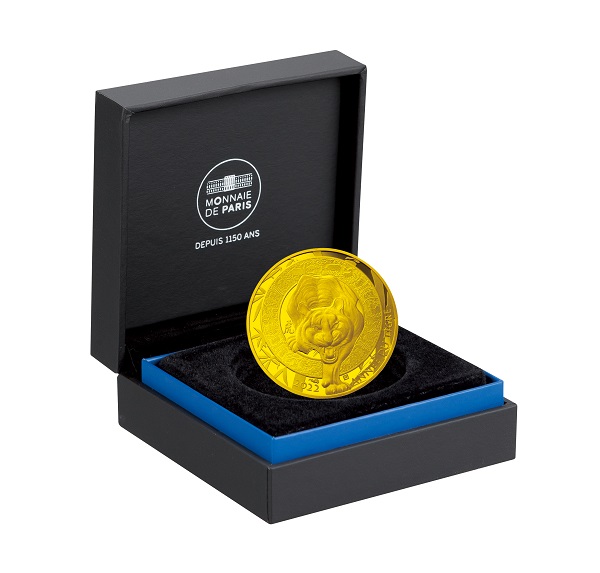 正面から見た虎が雄叫びをあげながら輪の中から身を乗り出している、フランス国立造幣局らしい独創的なデザイン。輪の中には十二支の動物や植物のモチーフ、周囲には竹林が微細な彫刻で描かれています。中国の書道家・趙長青氏による「虎」の文字や仏語「ANNÉE DU TIGRE」と刻まれています。