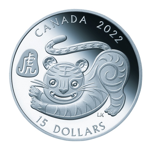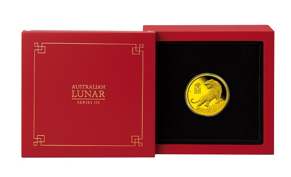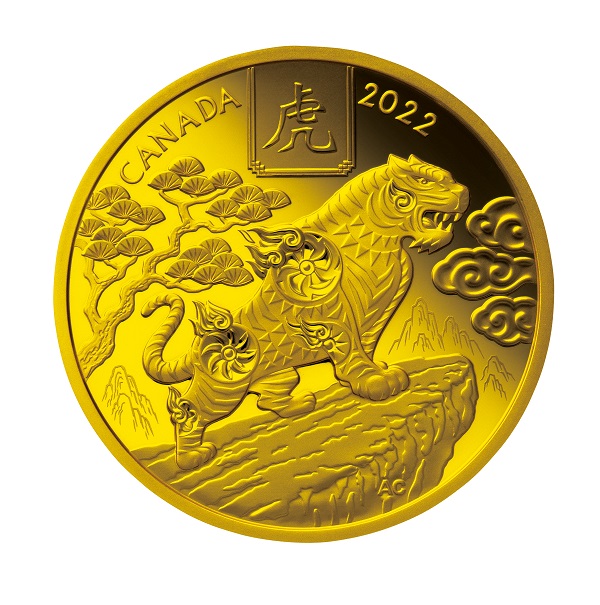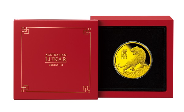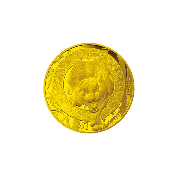 岩山の上に立ち、牙をむきながら吠える虎の猛々しい姿を大きく描いたシンプルなデザイン。虎のシンボルとも言えるシマ模様や毛並み、岩肌などが緻密な刻印技術でリアルに表現されています。漢字の「虎」や「TIGER2022」 、パース造幣局で鋳造されたことを示すミントマーク「P」も刻印されています。