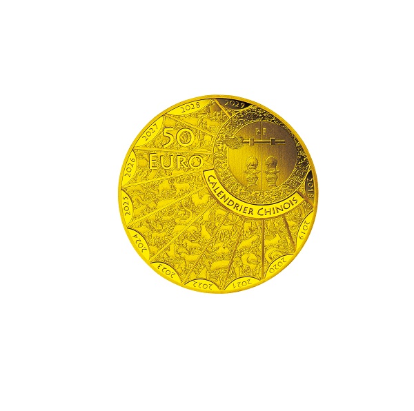 中国の伝統的な寺院の扉が右上に円形で描かれ、それを扇状に取り囲むように十二支の動物たちが精緻な彫刻技術でランダムかつ重層的に描かれています。周りには年号(2018年~2029年)や、フランス語で「CALENDRIER CHINOIS」(中国暦)と刻まれています。