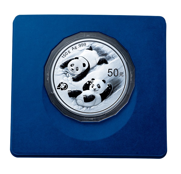 雪の上で楽しそうに遊ぶ2頭のジャイアントパンダの子供がデザインされています。雪のモチーフは、2022年2月に開催された「オリンピック冬季競技大会北京2022」に着想を得たものです。パンダ特有の白黒模様は、黒い部分をプルーフ仕上げ、 白い部分をマット仕上げにすることで表現。毛並みや背景の雪も、緻密な彫刻により立体的に描かれています。また、40周年ロゴマークのほか、額面、純度、重さなども刻印されています。 |