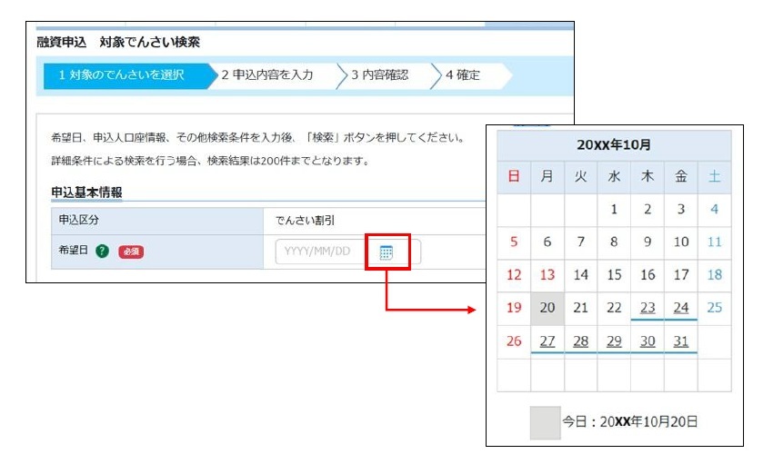(画面イメージ)20XX年10月20日(月)に申込の場合、20XX年10月23日(木)(翌3営業日)以降が選択可能となります。