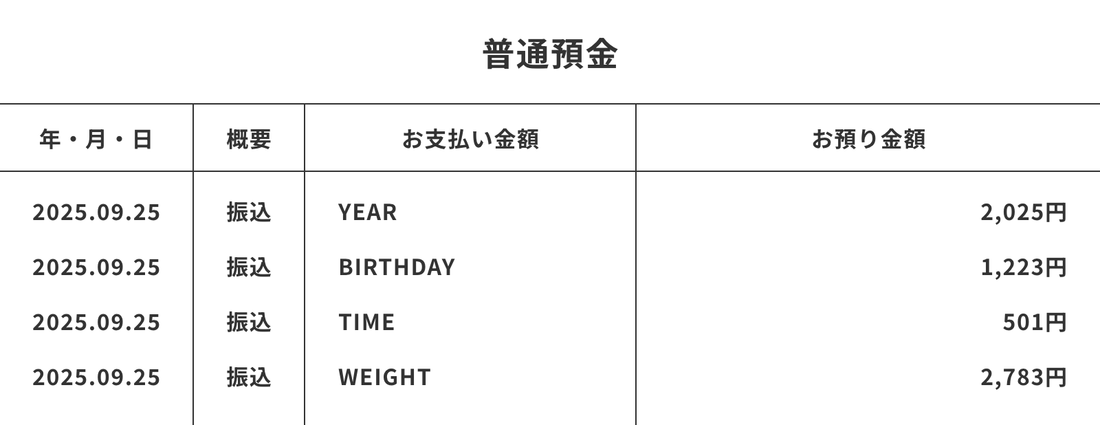 インターネットバンキング「プライベートWeb」を使って振込⼈名を変更し、出⽣⽇時や体重、⾝⻑などと同じ⾦額を親の⼝座から振込むことで、⼤切な情報を記録する「出⽣体重預⾦」がおすすめです。