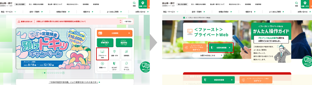 ご登録がお済みでないお客さまは、当⾏ホームページ「<ファースト>プライベート Web」より初回利⽤登録をお願いいたします。