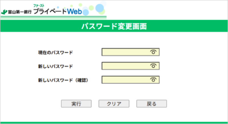 パスワードを失念された場合には、初期パスワードへのリセットが必要となります。パスワードリセットのお申込みはお取引店へお問い合わせください。